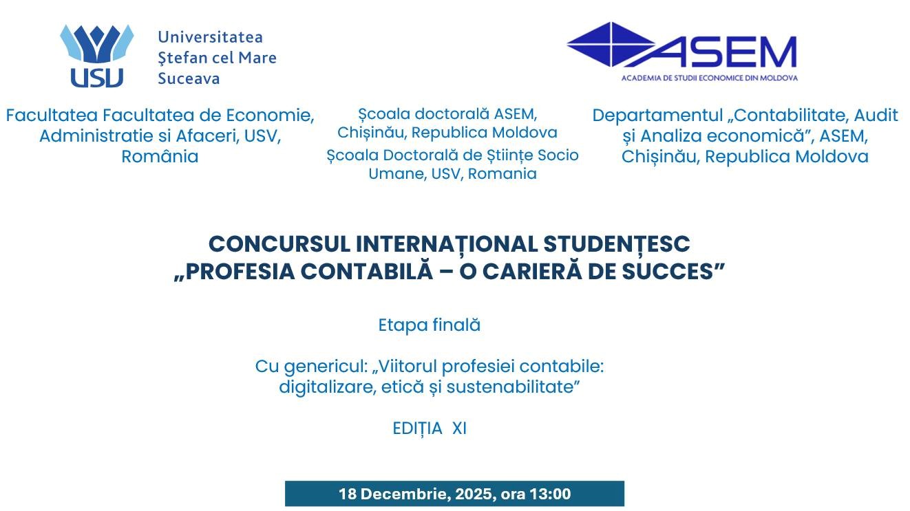 𝑈𝑛𝑖𝑣𝑒𝑟𝑠𝑖𝑡𝑎𝑡𝑒𝑎 𝑆̦𝑡𝑒𝑓𝑎𝑛 𝑐𝑒𝑙 𝑀𝑎𝑟𝑒 𝑑𝑖𝑛 𝑆𝑢𝑐𝑒𝑎𝑣𝑎, în colaborare cu 𝘈𝑐𝘢𝑑𝘦𝑚𝘪𝑎 𝑑𝘦 𝘚𝑡𝘶𝑑𝘪𝑖 𝐸𝘤𝑜𝘯𝑜𝘮𝑖𝘤𝑒 𝑑𝘪𝑛 𝑀𝘰𝑙𝘥𝑜𝘷𝑎, organizează cea de-a 10-a ediție a 𝐂𝐨𝐧𝐜𝐮𝐫𝐬𝐮𝐥𝐮𝐢 𝐈𝐧𝐭𝐞𝐫𝐧𝐚𝐭̦𝐢𝐨𝐧𝐚𝐥 𝐒𝐭𝐮𝐝𝐞𝐧𝐭̦𝐞𝐬𝐜 „𝐏𝐫𝐨𝐟𝐞𝐬𝐢𝐚 𝐜𝐨𝐧𝐭𝐚𝐛𝐢𝐥𝐚̆ – 𝐨 𝐜𝐚𝐫𝐢𝐞𝐫𝐚̆ 𝐝𝐞 𝐬𝐮𝐜𝐜𝐞𝐬”, sub genericul „𝘗𝑟𝘰𝑓𝘦𝑠𝘪𝑎 𝐶𝘰𝑛𝘵𝑎𝘣𝑖𝘭𝑎̆ 𝑖̂𝘯 𝘦𝑟𝘢 𝘱𝑟𝘰𝑣𝘰𝑐𝘢̆𝑟𝘪𝑙𝘰𝑟 𝑑𝘪𝑔𝘪𝑡𝘢𝑙𝘦”.